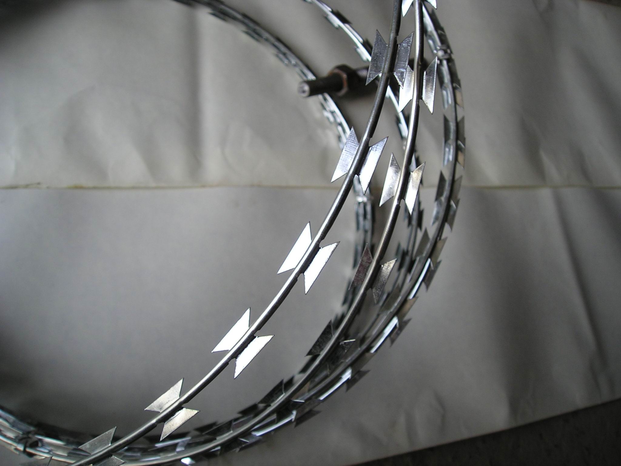 刀片刺網(wǎng)也習(xí)慣被大家稱作蛇腹形刀片刺網(wǎng),因?yàn)槠湫螤钕褚粭l蛇。雙螺旋刀片刺網(wǎng)與單螺旋刀片刺網(wǎng)的最大區(qū)別:相鄰的兩根刺繩用卡扣固定,拼接在一起的刀片刺網(wǎng)展開后,交叉在一起。更大程度上減少了刺繩之間的間隙,防護(hù)效果大大提升。